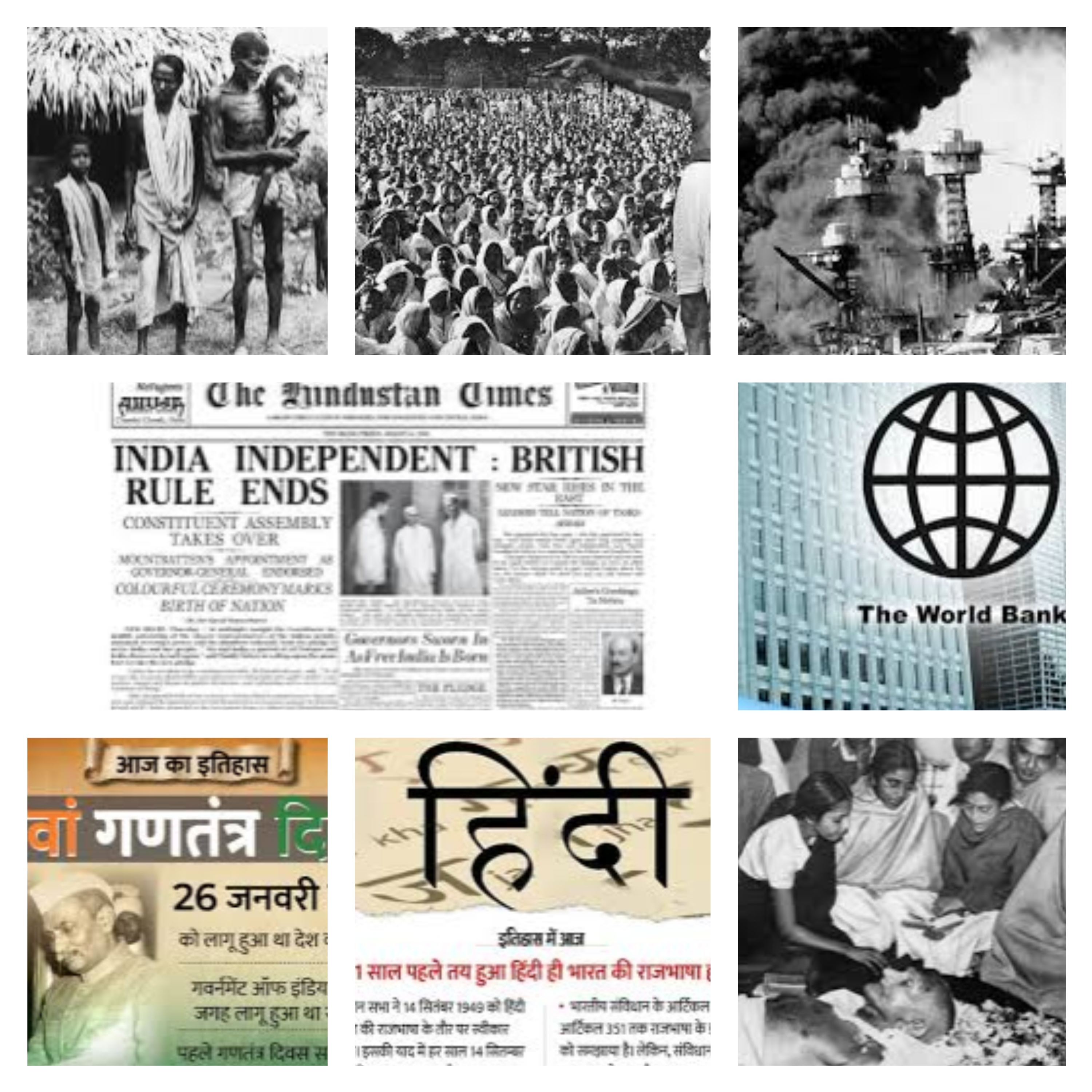 पर्ल हार्बर पर जापान का आक्रमण। महात्मा गांधी द्वारा भारत छोड़ो आदोलन प्रारंभ । बंगाल अकाल से लाखों लोगों की मृत्यु। विश्व बैंक की स्थापना । द्वितीय विश्व युद्ध की समाप्ति। भारतीय नौसेना विद्रोह । भारत ने ब्रिटेन की पराधीनता से मुक्त स्वतंत्रता पाई। भारत-पाकिस्तान विभाजन। महात्मा गांधी की हत्या। भारतीय संविधान का अभिग्रहण। 14 सितंबर को हिन्दी को राजभाषा बनाया गया। भारत गणतंत्र राष्ट्र बना।