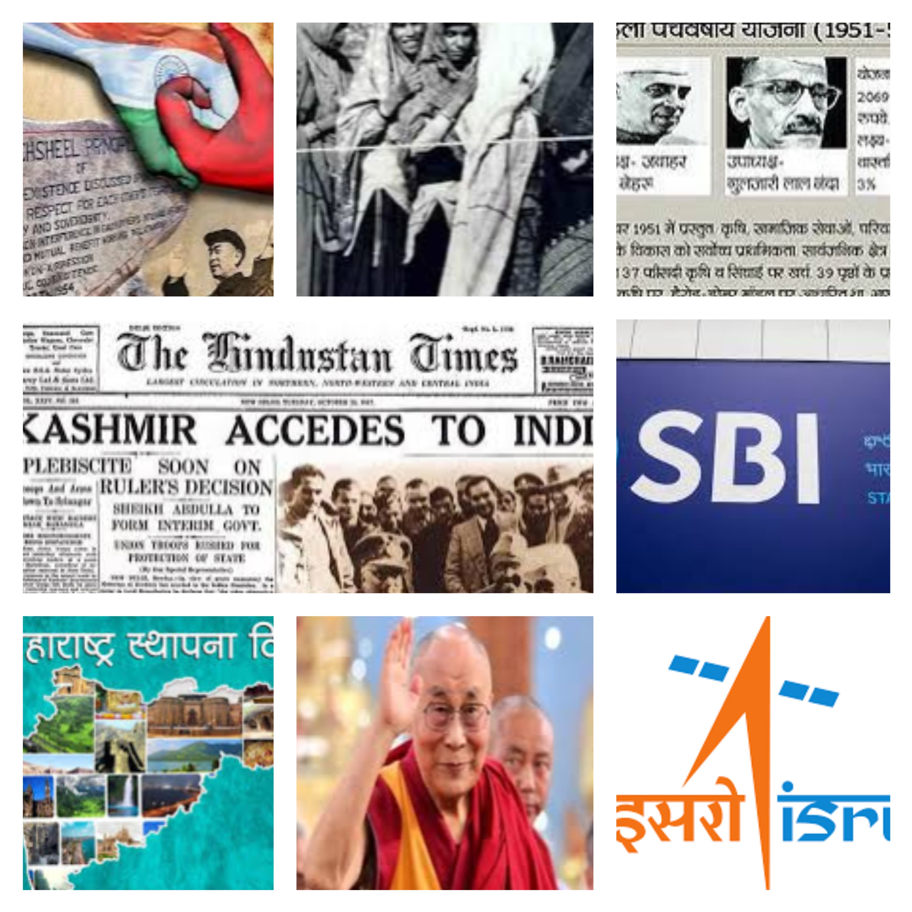 प्रथम पंचवर्षीय योजना प्रारंभ। भारत के प्रथम आम चुनाव। भारत और चीन में पंचशील समझौता। भारतीय स्टेट बैंक प्रारंभ । 14 राज्यों और पाँच केंद्र शासित राज्यों को संगठित किया गया। कश्मीर की भारत विलय की स्वीकृति। ISRO की स्थापना। दलाई लामा ने तिब्बत की आजादी के लिए भारत में शरण ली। महाराष्ट्र से पृथक गुजरात नया राज्य बना।