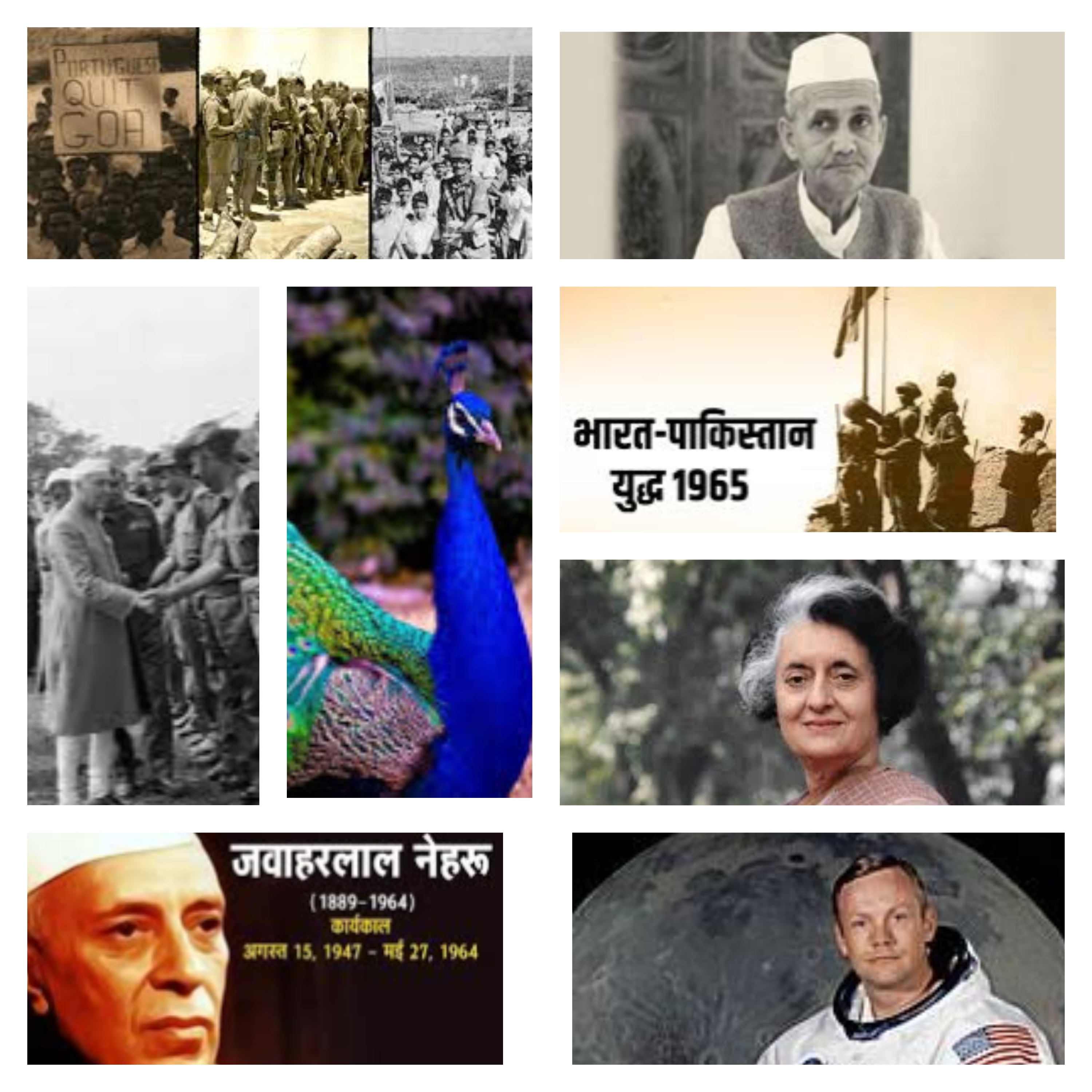 पुर्तगाल शासन से गोवा मुक्त हुआ। भारत- चीन युद्ध। मोर भारत का राष्ट्रीय पक्षी घोषित। भारत के प्रथम प्रधानमंत्री जवाहरलाल नेहरू का देहांत। लाल बहादुर शास्त्रीय द्वितीय प्रधानमंत्री बने। भारत-पाकिस्तान युद्ध। इंदिरा गांधी भारत की प्रधानमंत्री बनी।हरित क्रांति प्रारंभ।राजभाषा प्रस्ताव पारित। नील आर्मस्ट्रांग चांद पर उतरे। भारतीय बैंकों का राष्ट्रीयकरण। कांग्रेस का गरीबी हटाओ नारा।